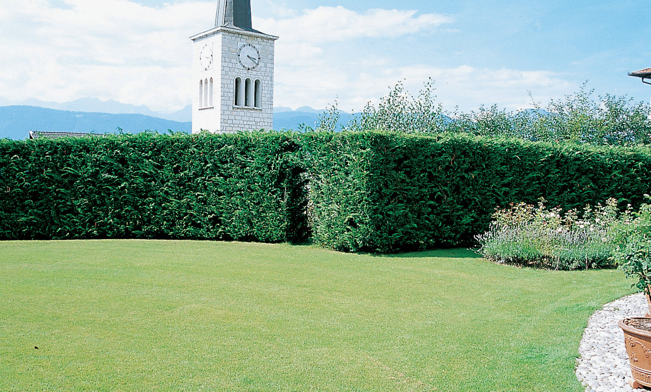 Un gran seto delimita el jardín y cierra la visión del exterior; por encima, sobresale sólo un campanario