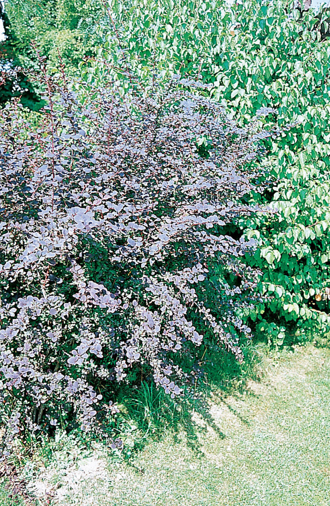 Setos informales con matorrales agradablemente combinados y hojas de colores distintos; en primer plano las hojas rojas marrones del Berberis