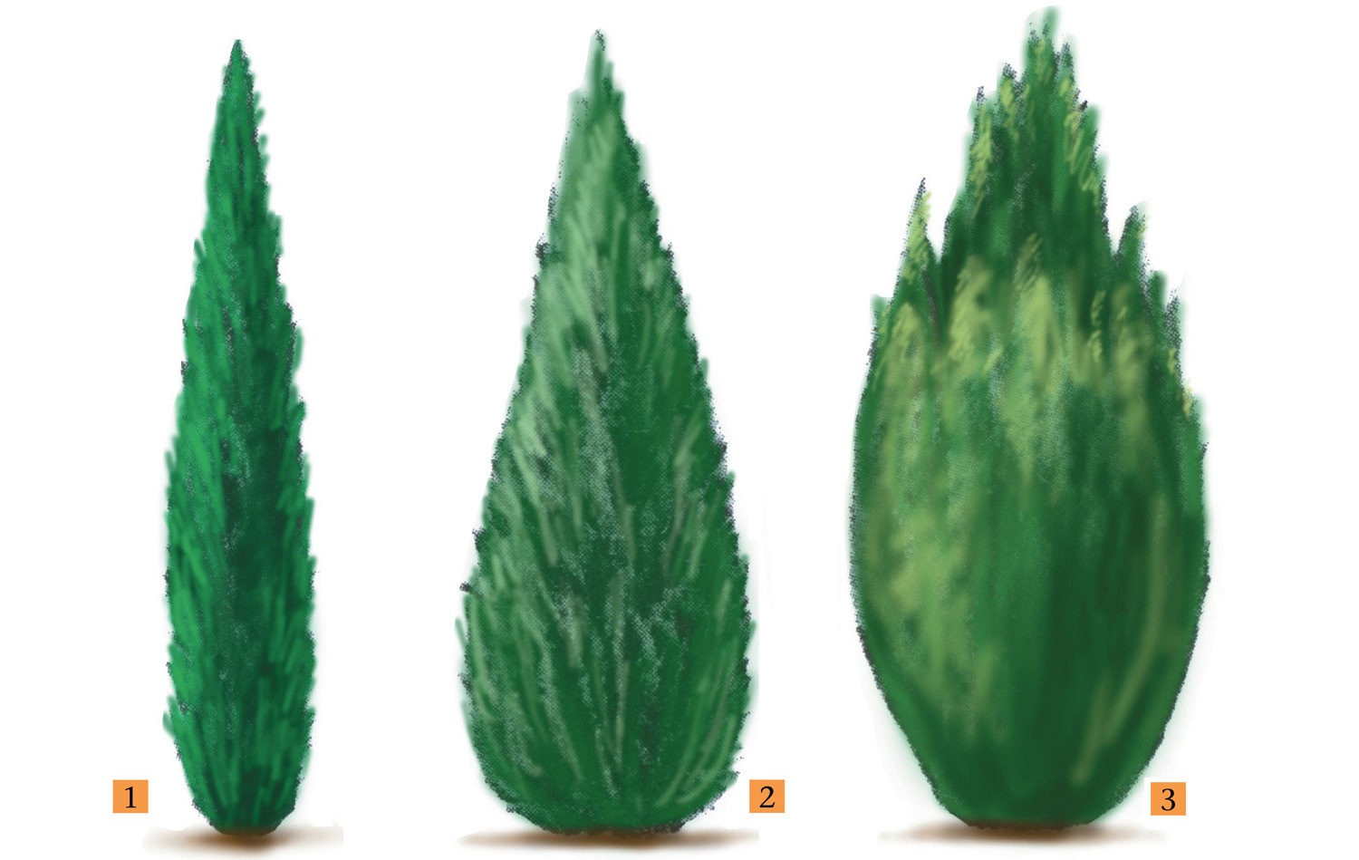 1. Juniperus «Skyrocket»; 2. Chamaecyparis lawsoniana «Columnaris»; 3. Chamaecyparis lawsoniana «Ellwodii»