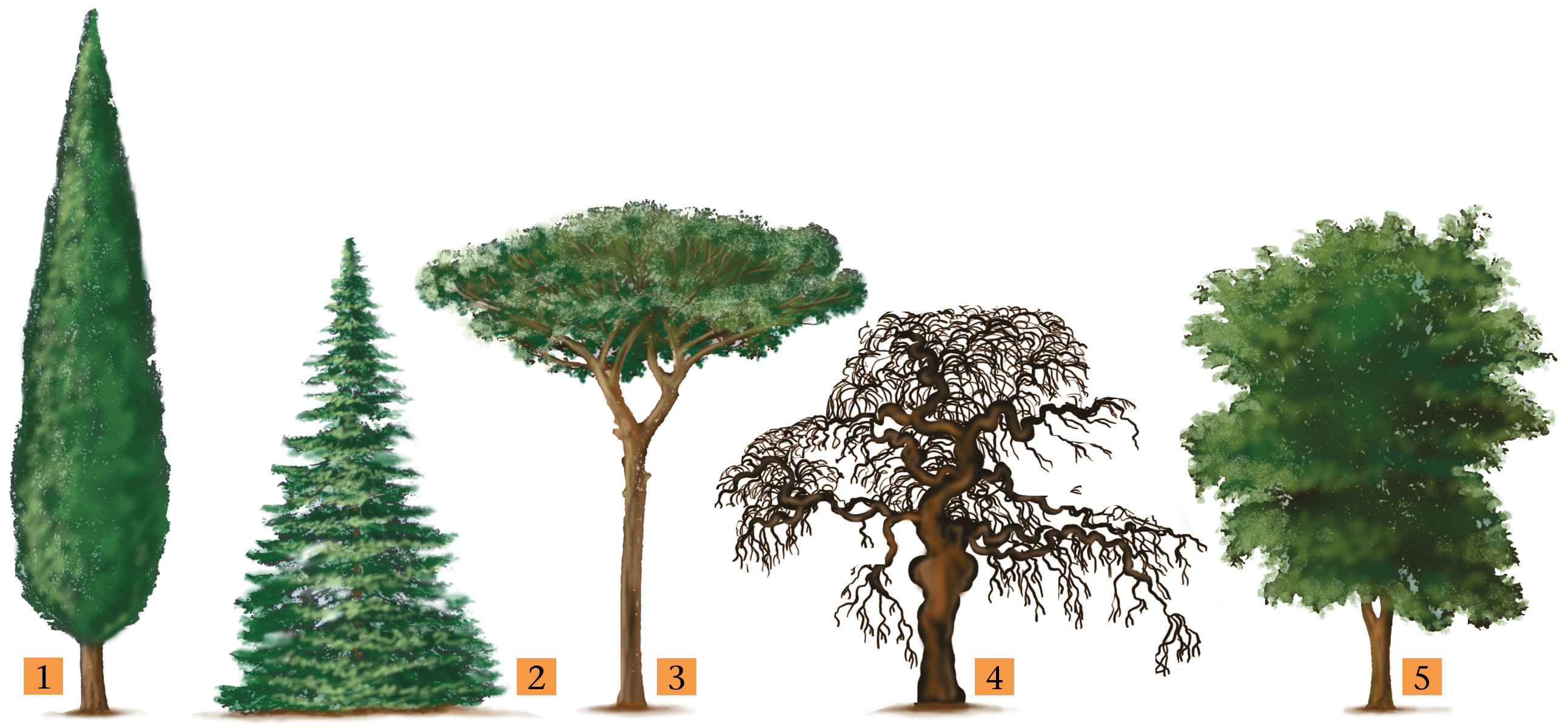 1. columnar; 2. piramidal o escalar; 3. parasol; 4. caído o péndulo; 5. expandido o natural