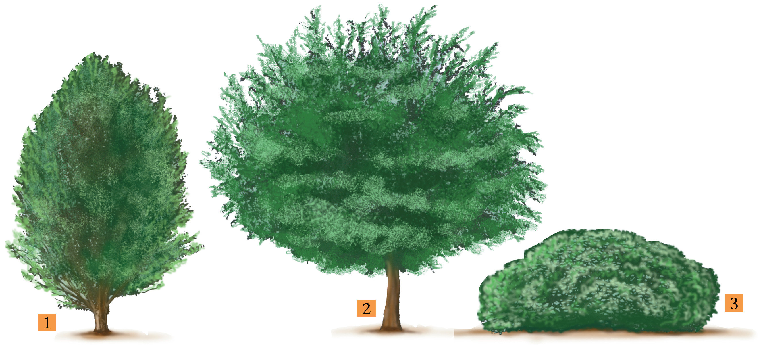 1. cónico u ovoidal; 2. globoso; 3. postrado (arbustivo)