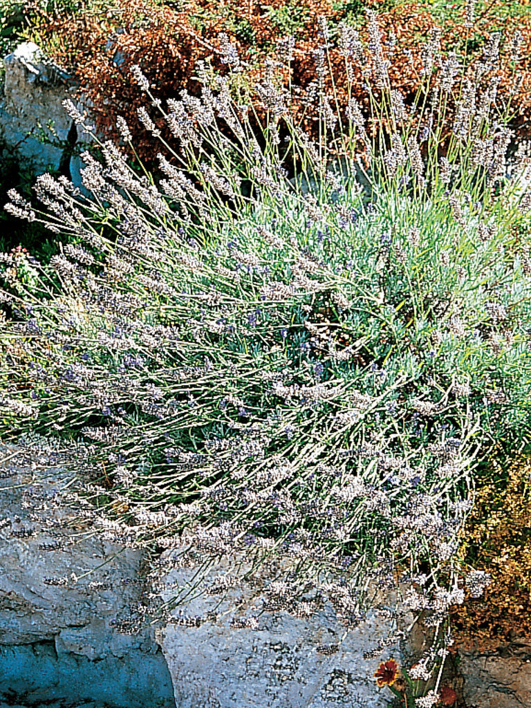Combinación de colores y perfumes: el violeta de la lavanda acompañado con el rojo naranja de los frutos de Cotoneaster