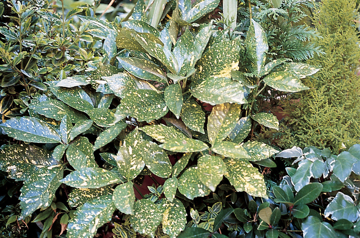 Las diferentes tonalidades verdes de aucuba, Chamaecyparis, Cupressus, hiedra abigarrada y ligustro