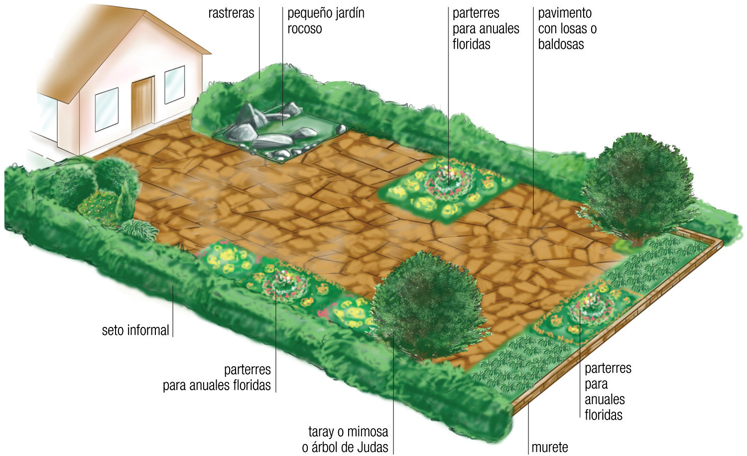 Con sólo 50 m2 de terreno delante de la casa se puede crear un jardín práctico y agradable. En este caso habrá que descartar de entrada la presencia de árboles de tronco alto y decantarse por especies arbustivas para el contorno. Asimismo, conviene sustituir el césped por un pavimento elegante, en donde se insertarán algunos cuadrados de tierra, preferiblemente a niveles diferentes, que se llenarán con plantas rastreras o pequeñas anuales de flor. Una alternativa podrían ser pequeños parterres y grava en donde se colocan macetas con plantas anuales o enanas de fruto y ornamentales, o también arbustos (hortensias, rosas o lilas). La opción de tener la vegetación en macetas ofrece la posibilidad de cultivar en climas septentrionales plantas típicamente meridionales (plantas crasas, palmas, helechos y algunas plantas clásicas de interior), porque al llegar el frío pueden ponerse a resguardo.