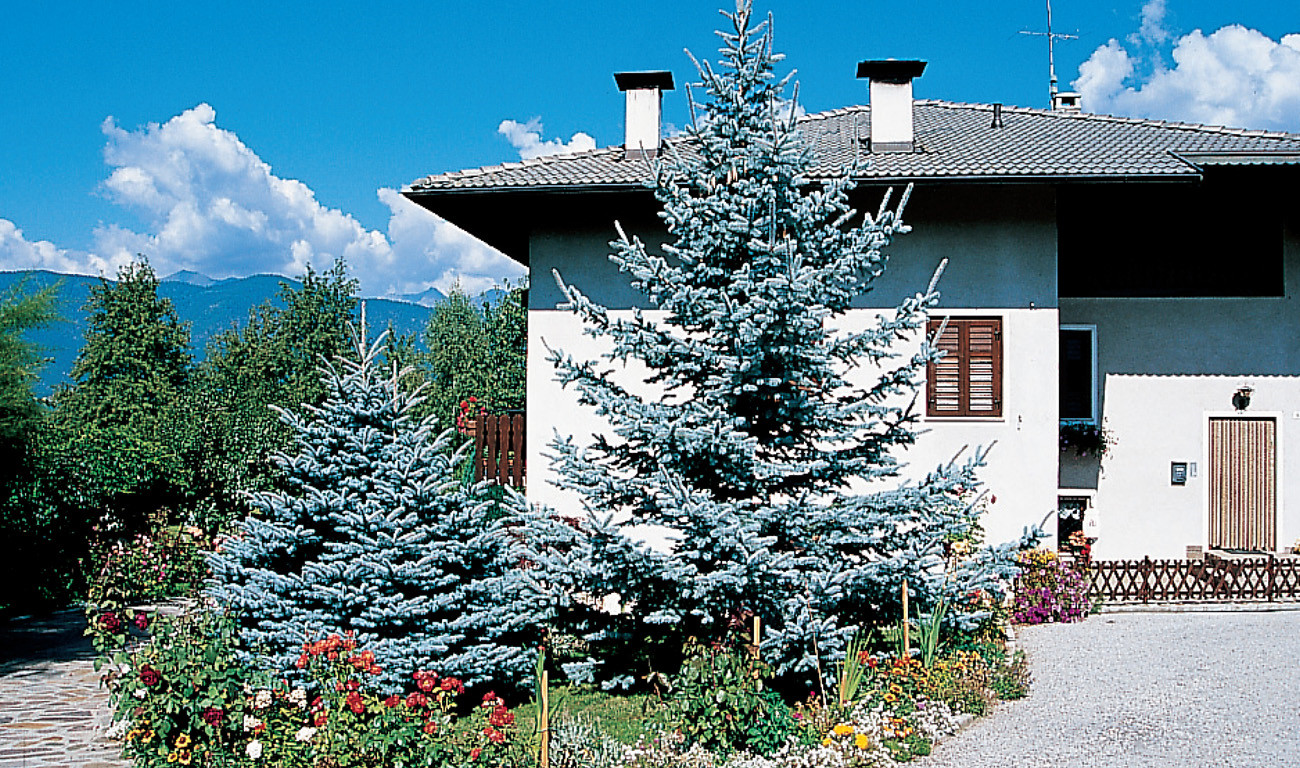 Una pequeña área verde delante de la casa: la bordura de flores enmarca los abetos plateados