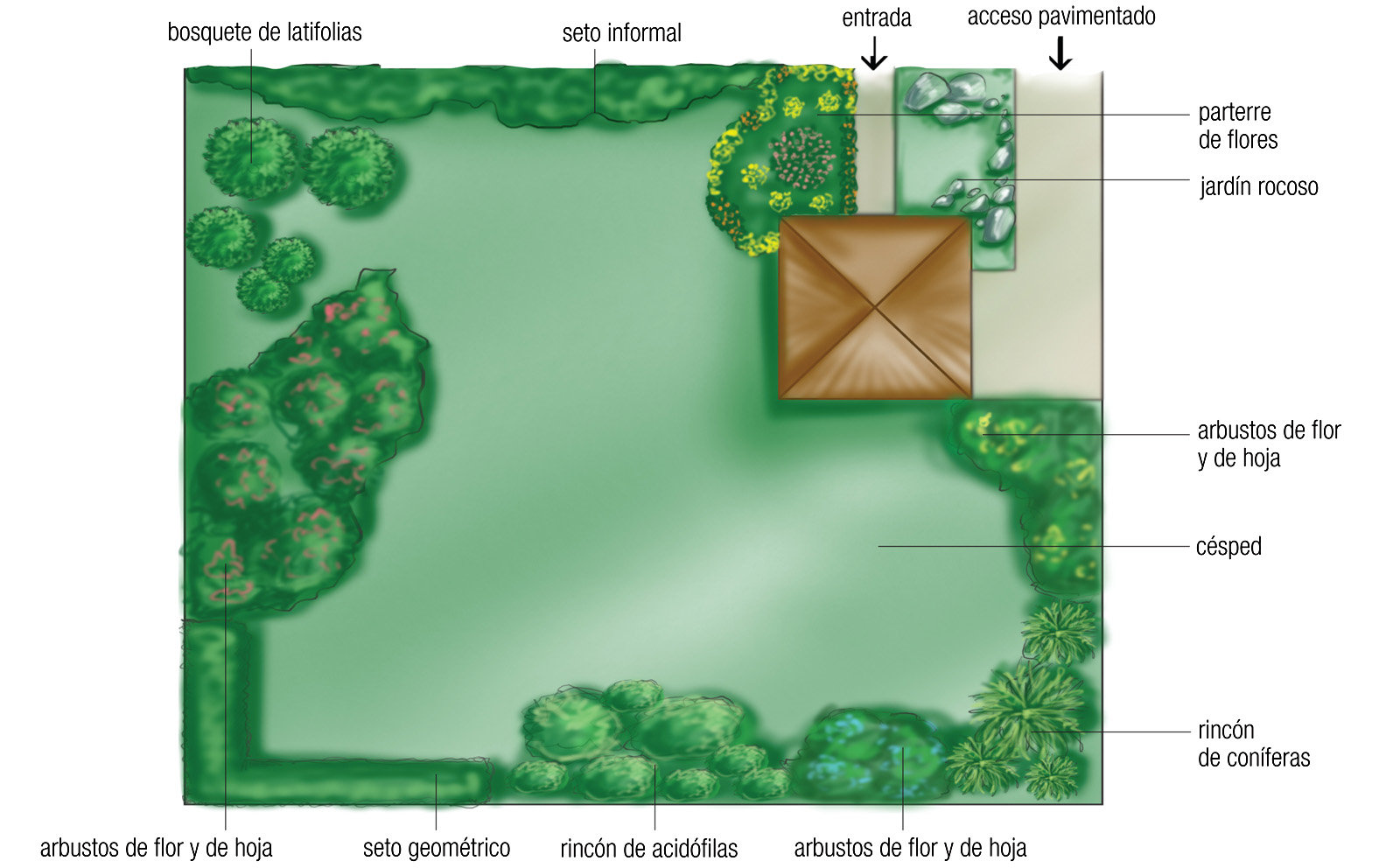 Un buen punto de partida puede ser la planimetría del terreno y de la casa, que son componentes fundamentales del proyecto de la vivienda. Si la superficie externa es suficientemente amplia, hay que dividir el terreno en «zonas» con diferentes funciones: