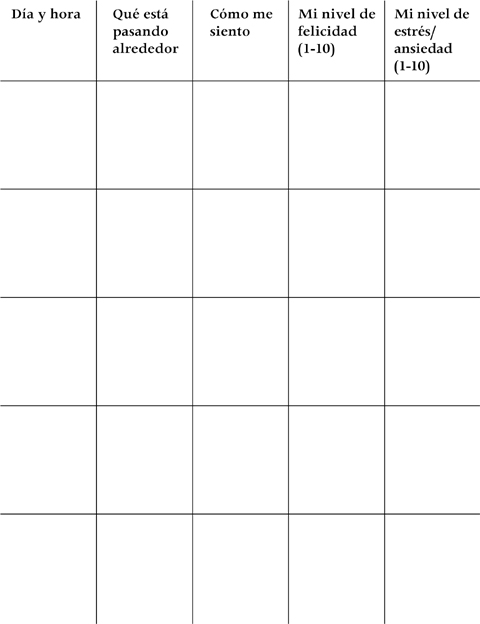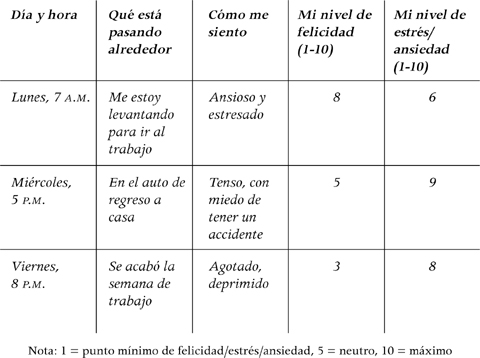 Otra cosa que quiero que hagas a lo largo de este libro, es llevar un dia-rio de emociones. Es decir, para cada día que te sientas a trabajar en tus 7 pasos para ser más feliz, quiero que anotes lo que has hecho en el día o la semana, las horas en que lo has hecho, y que anotes cómo te has es-tado sintiendo. Este ejercicio esencial te ayudará a observar cómo sube y baja tu estado de ánimo, al igual que qué factores te afectan y cuándo. Cada capítulo tendrá un diario un poco diferente, según el tema de ese capítulo. He aquí un ejemplo: