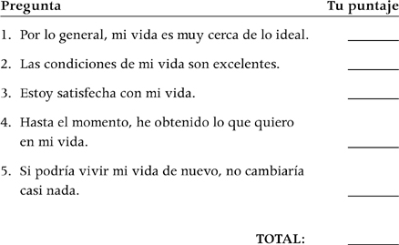 5 a 9 puntos: Estás extremadamente insatisfecho o descon-tento con tu vida. Las personas que obtienen este rango están usualmente extremadamente infelices con sus vidas. En algunos casos, esto es en reactión a un evento negativo como la muerte de un ser querido o desempleo. En otros casos la insatisfacción puede ser una respuesta a un problema continuo, como alcoholismo o adicción. Sin embargo, insatisfacción a este nivel es a menudo causada por múltiples áreas en la vida. Cualquiera que sea la razón para el bajo nivel de satisfactión en la vida, la ayuda de otros puede ser necesaria —consejería con un amigo, un familiar o un miembro de la iglesia, o ayuda de un psicólogo u otro consejero. Si la insatisfacción persiste, tienes que cambiar, y a menudo otros pueden ayudar. Habla con tu médico o contacta una organizatión de salud mental.