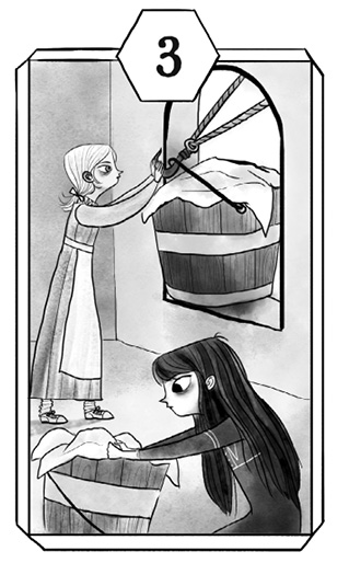Después de un almuerzo pobre que consistió en el caldo de repollo clásico de Fenna, Milou pasó una hora ayudando a Lotta a cargar un cubo tras otro de ropa limpia sobre un trineo que esperaba en el canal congelado. Luego, pasó la siguiente hora ayudando a Lotta a cargar un cubo tras otro de ropa sucia sobre un trineo distinto. Cuando el reloj de pie marcó las siete, Milou notaba los brazos como si fueran fideos y tenía las manos cubiertas de marcas por la fricción.