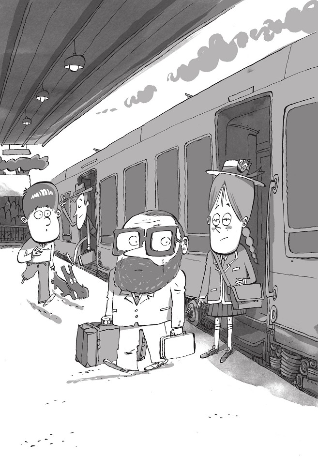 Fatty se alisó el cabello, mirando si se bajaba del tren algún hombre con una niña. Pronto vio a un hombre muy bajito con barba oscura y unas gafas enormes, que se afanaba con dos maletas. Con él iba una chica bastante más alta que el hombre, una niña robusta y desgarbada, con dos largas trenzas colgándole en la espalda. Llevaba el uniforme del colegio, un abrigo azul oscuro y un sombrero del mismo color, con una cinta de colores y una insignia en la parte izquierda.