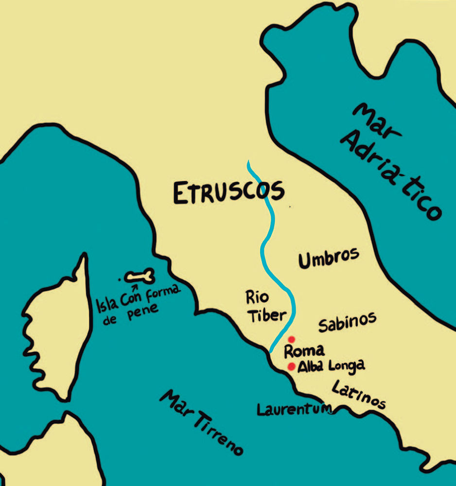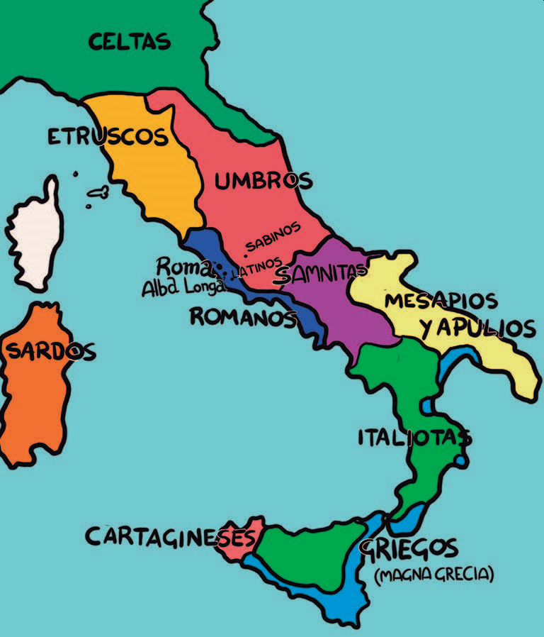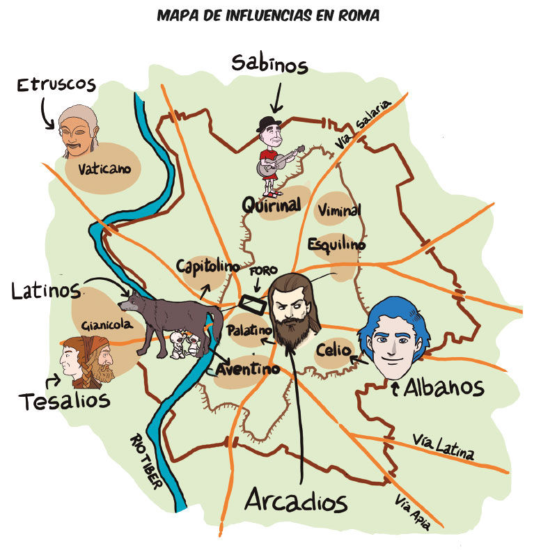 Como ves, hay etruscos en la colina Vaticana, sabinos en la Quirinal, latinos en la del Palatino, la Capitolina y la Aventina, tesalios en la Gianicola, arcadios en la del Palatino y albanos (de Alba Longa) en la de Celio. ¡Son los Estados Unidos de Roma!