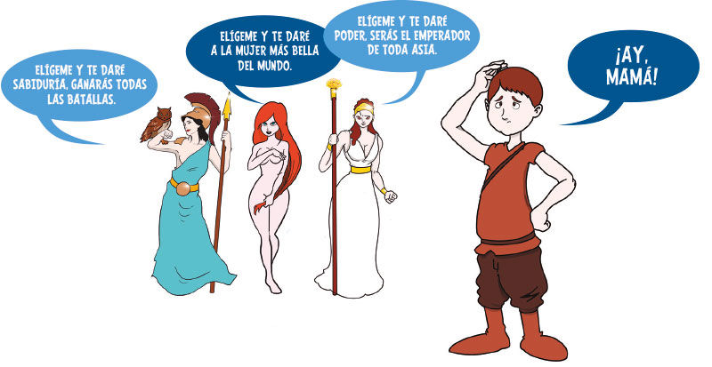 Peleo y Tetis (los futuros padres de Aquiles) celebraron su boda y se olvidaron de invitar a Eris, la diosa de la discordia. Esta decidió vengarse haciendo lo que mejor sabía hacer: meter cizaña. Tiró una manzana dorada en el lugar del banquete con una nota que decía «PARA LA MÁS BELLA». Los asistentes se preguntaban a quién se refería. De entre las invitadas destacaban claramente Atenea, Afrodita y Hera. Zeus debía elegir cuál de las tres diosas merecía esa manzana, pero, como no quería líos con ninguna, decidió que alguien imparcial lo decidiera. El elegido sería un pastor troyano: Paris.