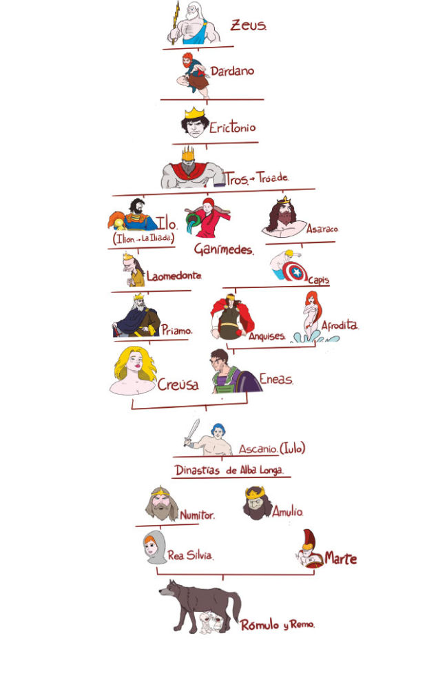 Pero ¿cuánto de real tenía esta sangre? ¿Por qué era tan importante ser descendiente de Eneas? Bueno, si estudiamos su árbol genealógico, veremos que tiene parentesco con Dárdano, el fundador de Dardania, la primera Troya. Y ese Dárdano es hijo de (redoble de tambores)... ¡Zeus!