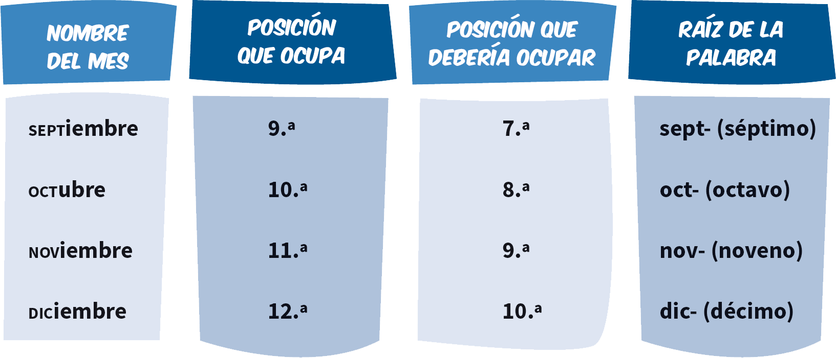Los nombres de septiembre, octubre, noviembre y diciembre corresponden a las posiciones que se les asignaron: septiembre, el séptimo; octubre, el octavo, etc., pero, como hemos visto antes, esas posiciones hoy en día ¡están mal! SEPTiembre debería ser el SÉPTimo mes, pero es el noveno.