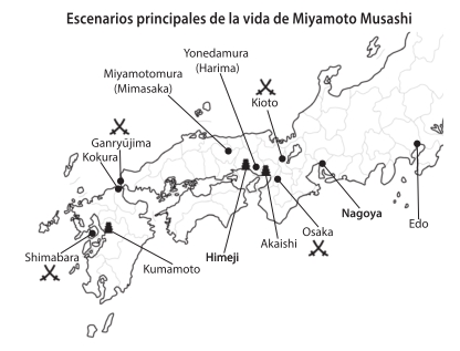 Tras el asedio, Musashi volvió a su tierra de origen y durante un tiempo se estableció en Himeji. Todos los daimios de la región —Honda, Ogasawara y Kuwana de Ise, y Matsumoto de Shinshū— no eran más que unos recién llegados, habiendo sido obligados por el sogunato a establecerse en la zona. Musashi conocía la región y tenía contactos, lo que hacía de él una persona muy útil. En 1617, aceptó el puesto de «invitado» (kyakubun)33 dentro del clan Honda, que se había trasladado hacía poco a la región para asumir el gobierno de Himeji. Como invitado, Musashi recibió el encargo de enseñar el arte de la espada a los samuráis del dominio. Cuando el sogunato ordenó que el clan Honda ayudara al vecino clan Ogasawara en la construcción del castillo de Akashi, Musashi recibió el encargo de diseñar la aldea que rodearía el castillo.34