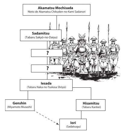 Como el árbol genealógico omite a dos generaciones enteras, no queda claro si los Tabaru de Yonedamura eran parientes directos del clan Akamatsu. Durante el periodo Edo, las familias de samuráis solían ampliar su linaje a través de alguna asociación poco convincente con un notable antepasado. Solía ser difícil, cuando no imposible, verificar la autenticidad de dicha asociación y, además, una vez que quedaba registrada por escrito, se convertía en parte indisoluble de la tradición familiar. Éste es el motivo por el que las raíces de Musashi están envueltas en tanto misterio. No obstante, las fuentes más fiables con las que contamos en la actualidad refuerzan la hipótesis de que Musashi era un Tabaru y de que se convirtió en el «hijo adoptivo» de Shinmen Muninosuke (Miyamoto Munisai) a la edad de nueve años.