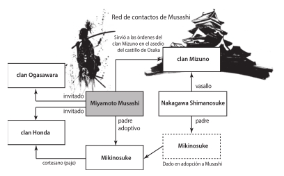 En esta época Musashi adoptó a Mikinosuke, el hijo de Nakagawa Shimanosuke, juez del clan Mizuno. Como resultado, Mikinosuke fue nombrado asistente del hijo del daimio de Himeji, aunque en 1626 se suicidaría tras el fallecimiento de su señor.35 Ese mismo año, Musashi adoptó a otro hijo, pero en esta ocasión se trataba de un pariente directo. Iori era el segundo hijo de Tabaru Hisamitsu, el hermano mayor de Musashi —por cuatro años—, y trabajaría como ayudante del daimio de Akashi, Ogasawara Tadazane. Como su nuevo hijo adoptivo había conseguido un trabajo remunerado, Musashi se convirtió en «invitado» de Tadazane y se trasladó a Akashi. Resultaba evidente que Iori era un joven de talento y, cinco años después, a los veinte años de edad fue ascendido a la distinguida posición de «mayor» (karō) del dominio. Se mire como se mire, el ascenso de Iori fue meteórico y es más que probable que tuviera bastante que ver con el prestigio de Musashi en el seno de la comunidad castrense.