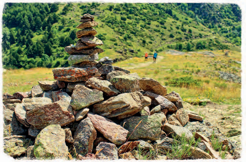 Desde que el excursionismo comenzara como actividad estrictamente lúdica (y, en ocasiones, científica) hace poco más de doscientos años, los montañeros han necesitado ayuda en los caminos. Los pioneros en los Alpes del s. XVIII lo hicieron con guías locales, a menudo pastores y ganaderos que conocían muy bien el territorio. Lo mismo sucedió en los Pirineos un siglo después. A medida que este deporte se fue popularizando, también lo hicieron las señales. Las primeras y más sencillas siguen utilizándose: mojones de piedras. En algunos lugares se les conoce por su nombre en inglés, cairn. Se trata de una simple columna de pedruscos de número indeterminado que se va colocando a la vera del camino para que el montañero sepa por dónde debe seguir. Todavía son muy comunes, especialmente en terrenos escarpados. Su existencia se debe a la generosidad de los propios senderistas, que los reponen a medida que van cayendo. Un acto de solidaridad con los que vendrán detrás de nosotros es aportar una piedrecita al montículo si este no es muy evidente. Si ya se encuentra firme y en buen estado, no hay por qué hacer más artificial la naturaleza.