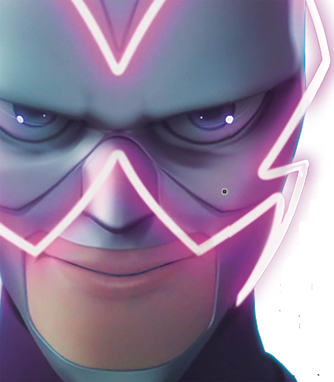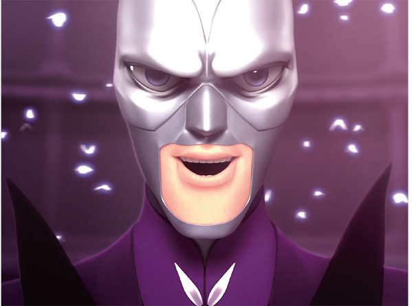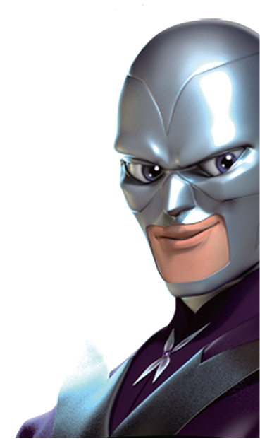 El villano ahora va vestido con un traje negro y lila, una máscara plateada le cubre el rostro y en su mano sostiene un bastón con una esfera de vidrio lila en el cabezal.