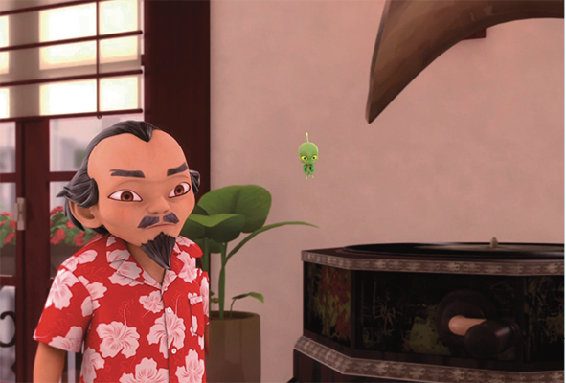 El anciano se acerca al gramófono, pulsa los ojos de los dragones que decoran la base y, al instante, estos se iluminan de color rojo. Una compuerta entre las dos figuras reptiles deja al descubierto un panel con botones. Fu introduce una combinación secreta y al cabo de unos segundos el gramófono se abre. En su interior hay una cajita con un grabado rojo en la tapa.
