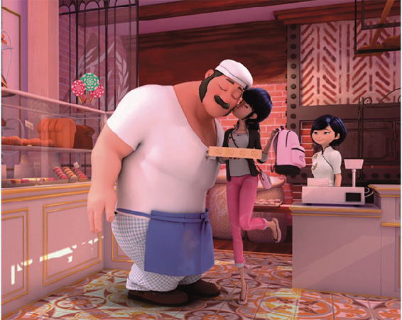 Marinette se arregla y baja a la panadería, que pertenece a sus padres. Mientras su madre le prepara un bocadillo con una baguette recién horneada, su padre le da una cajita de deliciosos macarrones para que se la lleve a la escuela.