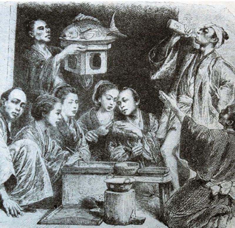 Servicio de sake en Japón en la década de 1860.