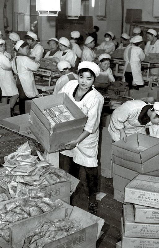 Una operaria sostiene una caja de Chikin Ramen en 1960.