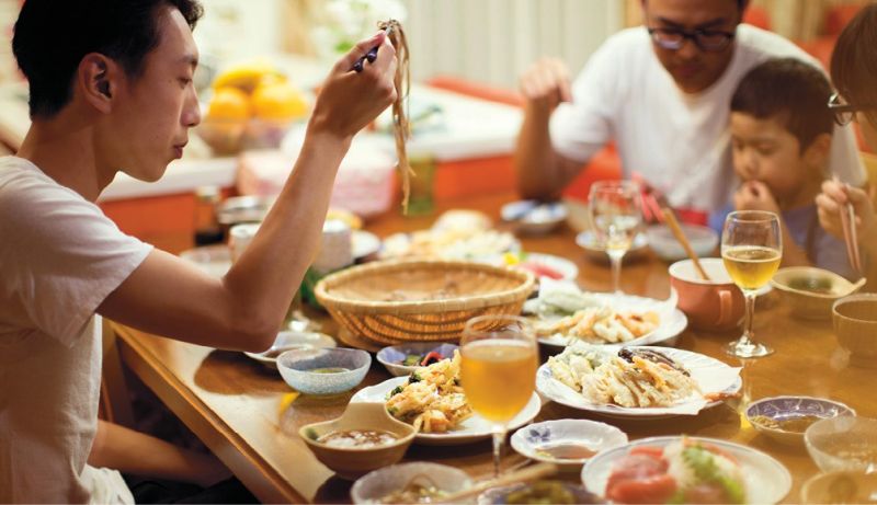 Tempura, algas y fideos en una reunión familiar.
