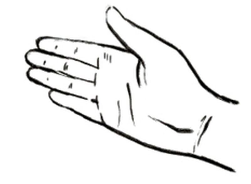 Abrir la mano dominante con el pulgar extendido y separado de la palma, como si se fuera a estrechar la mano.