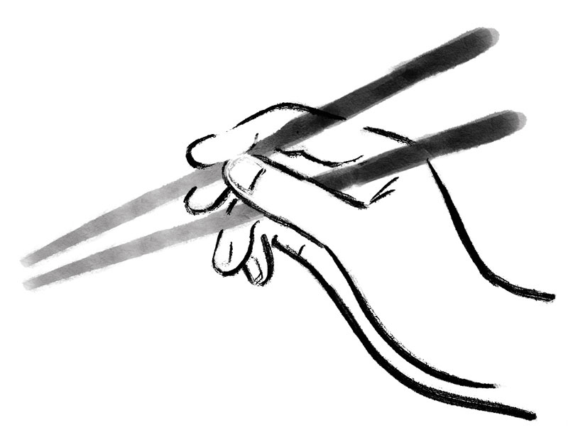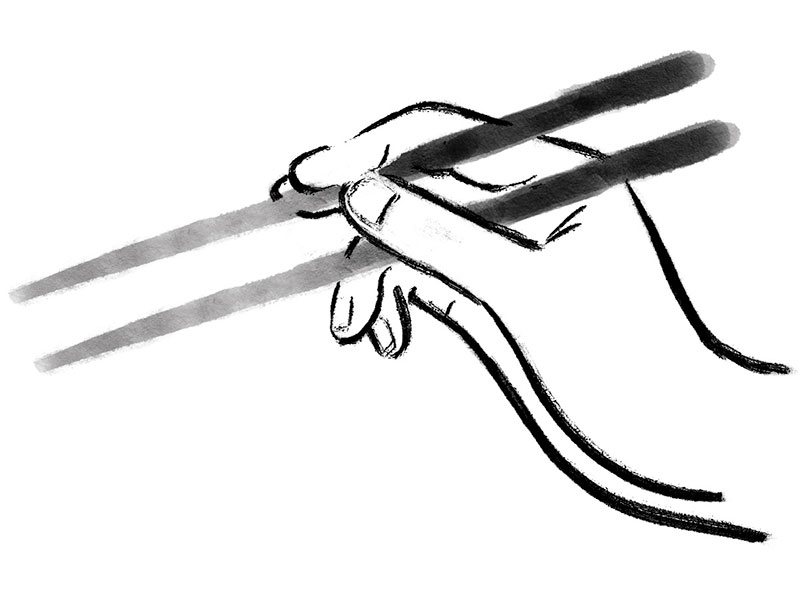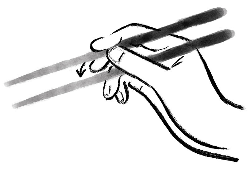 Sostener el segundo palillo entre el pulgar y el índice apoyándolo en este último, como cuando se sostiene un bolígrafo.