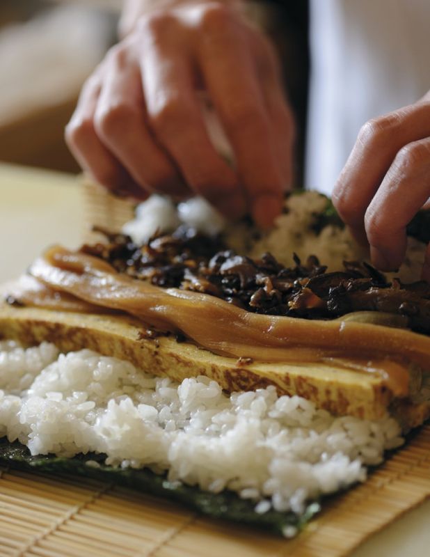 Un chef prepara futo-maki (rollos gruesos de sushi).