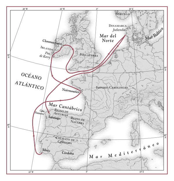 En el año 844 naves vikingas llegaban por primera vez a las costas cántabras. Una tormenta las había desviado de su rumbo de navegación por el litoral oeste de Francia. Tras saquear algunas localidades, como Gijón, los fieros hombres del norte sufrieron una dura derrota en Galicia a manos de las levas del rey asturiano Ramiro I. Aun así, diezmados y todo, prosiguieron ruta por la costa portuguesa hasta llegar a Cádiz. Desde allí alcanzaron Sevilla y procedieron a saquearla e incendiarla. Los sevillanos, con apoyo de Córdoba, capital andalusí, consiguieron vencer a los vikingos en Tablada. Los hombres del norte supieron que habían topado con una importante potencia militar, bien organizada y expansiva, encumbrada en al-Ándalus por el dominio omeya. Fue entonces cuando Abderramán II encargó al erudito apodado al-Ghazal, «la gacela» (para los árabes uno de los animales arquetípicos de la belleza), que preparara una embajada a las peligrosas tierras del norte de las que procedían los llamados westfaldingi, en respuesta a otra que los vikingos habían enviado a Córdoba con la intención de prestar ayuda a los suyos, dispersos por Cádiz y el Algarve tras la derrota, y ya de paso establecer lazos comerciales con el apetecible mercado andalusí. Al-Ghazal ya tenía experiencia en el terreno diplomático tras haber encabezado una misión a Bizancio en el año 840, de la que apenas hay noticias. Los objetivos eran claros: frenar las incursiones vikingas en el ámbito hispano-musulmán; establecer alianzas contra los peninsulares no islamizados y los francos cristianos; y conseguir acuerdos comerciales que incluían el intercambio de productos entre los que no faltaban las valiosas pieles de las tierras y mares del septentrión ni el músculo de los esclavos. Al-Ghazal contaba por entonces con 50 años, sin que la edad hubiera hecho merma alguna en su fina inteligencia, su elocuencia y, sobre todo, en su ardiente carácter. El embajador cordobés, apoyado por un tal Yahya ibn Habib, posiblemente un astrónomo experto también en las artes de la navegación, acompañó al representante del rey de los vikingos en su viaje de vuelta a la corte de los majus, también así llamados. No se conoce con precisión el destino exacto de la misión diplomática, ya que pudo haber sido Irlanda, Dinamarca e incluso Noruega. Las hipótesis más aceptadas son las que mantienen que al-Ghazal, aunque tocó Irlanda, recién invadida por los vikingos noruegos, llegó finalmente a Jutlandia (actual Dinamarca), que definió como una isla a pesar de que se trataba de una península. Ambos partieron en dos knörr (embarcaciones de dos velas utilizadas por los vikingos en largas travesías) bien equipados del puerto de Silvés, al sur del Algarve portugués, con rumbo a Noirmoutier. Era noviembre de 844. Doblaron Finisterre y se dirigieron a la península de Kerry, en tierras irlandesas, para dirigirse después posiblemente a Clonmacnoise, punto de encuentro con los monarcas norteños, según indican algunas versiones. Por delante esperaban veinte meses de estancia en tierras vikingas, en las que al-Ghazal logró recopilar valiosa información que incluía estudios sobre etnografía, costumbres y descripciones geográficas. El relato de los acontecimientos fue transmitido por el propio al-Ghazal a Tammam ibn Alqama y este, a su vez, pasó la información al valenciano ibn-Dihya, nacido en el año 1159, que fue quien finalmente escribió el texto en el que se narra tan magna empresa. A diferencia de otros escritores de viajes de su época, ibn-Dihya se limitó a transcribir los datos que le fueron aportados, sin incluir elementos mágicos, mitológicos ni productos de su propia imaginación, por lo que sus palabras gozan de gran credibilidad.