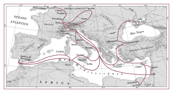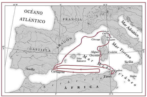 Su cuarto viaje fue el que supuso su regreso a España, pero no por la vía rápida, pues sus ojos aún tenían mucho que ver y su mano mucho que anotar. Así que de Ferrara viajó a Florencia pasando por Venecia, Vicenza y Verona. Una vez más pretendió llegar a Venecia, pero su curiosidad le hizo detenerse en Bolonia y, de nuevo, en Ferrara, desde donde otra vez se dirigió a Venecia. En la bellísima ciudad de los canales esperó durante un largo mes un embarque apropiado hasta que, al fin, una nave de Sicilia lo llevó por el Adriático tocando en los puertos de Rímini, Pesaro, Fano, Ancona y Brindisi para llegar a Messina, contemplar el volcán Strómboli desde las islas Lípari, rodear completamente la isla de Sicilia y toparse con el majestuoso y siempre amenazante volcán Etna. Malos vientos empujaron su nave hacia África, concretamente a Túnez, desde donde llegó a la isla de Cerdeña, última etapa antes de regresar a su España natal. La línea recta es el camino más corto entre dos puntos, pero no siempre es el mejor. O por lo menos no lo era para él.