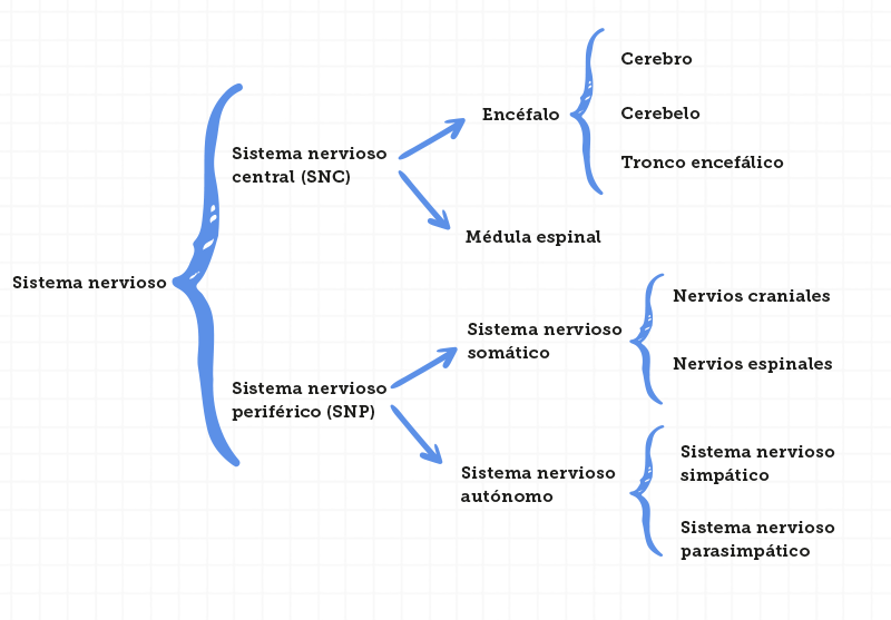 Por su parte, el sistema nervioso periférico se divide en sistema nervioso somático y sistema nervioso autónomo. El sistema nervioso somático se compone de nervios craneales y nervios espinales; mientras que el sistema nervioso autónomo tiene dos partes: sistema nervioso simpático y sistema nervioso parasimpático.