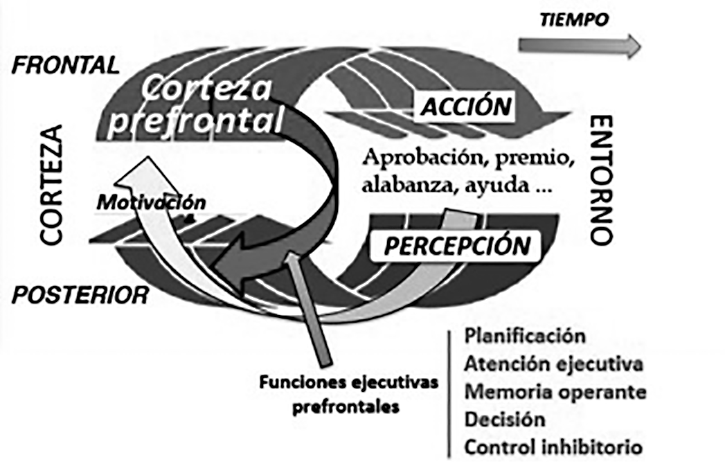 El ciclo percepción-acción puede entrar en función en cualquier parte del mismo: en el entorno físico o social del individuo, en su medio interno por un estímulo visceral o instintivo, como el hambre, o en su corteza cerebral, en forma de un plan de acción con objetivo o una imagen pictórica o musical. Con ellos, el niño aprende a razonar de modo lógico, inductiva y deductivamente. En cualquier caso, la corteza prefrontal, en coordinación con otras cortezas y estructuras subcorticales motoras, utiliza sus funciones ejecutivas para organizar acciones sucesivas en pos del objetivo. Cada acción produce cambios en el entorno que generan estímulos sensoriales, perceptuales, los cuales, analizados por la corteza perceptual (posterior), informarán a la corteza prefrontal acerca de los resultados de la acción y la prepararán para la acción siguiente, con correcciones y ajustes si son necesarios, y así sucesivamente, siempre con referencia al plan interno y su objetivo.