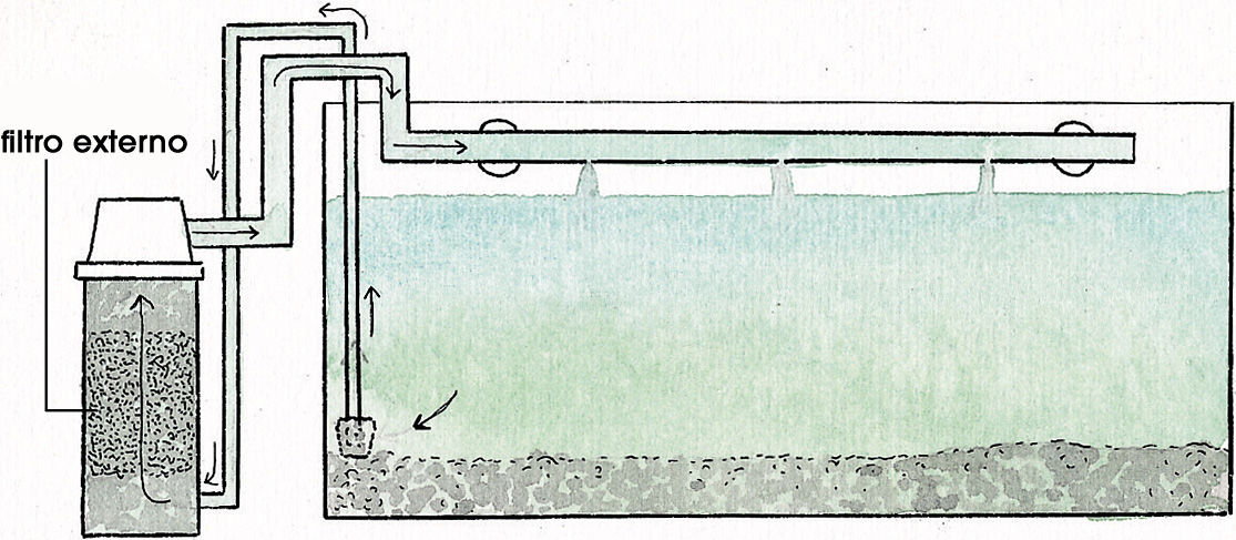Las flechas indican el recorrido que sigue el agua, que vuelve al acuario a través de un tubito con distintos orificios