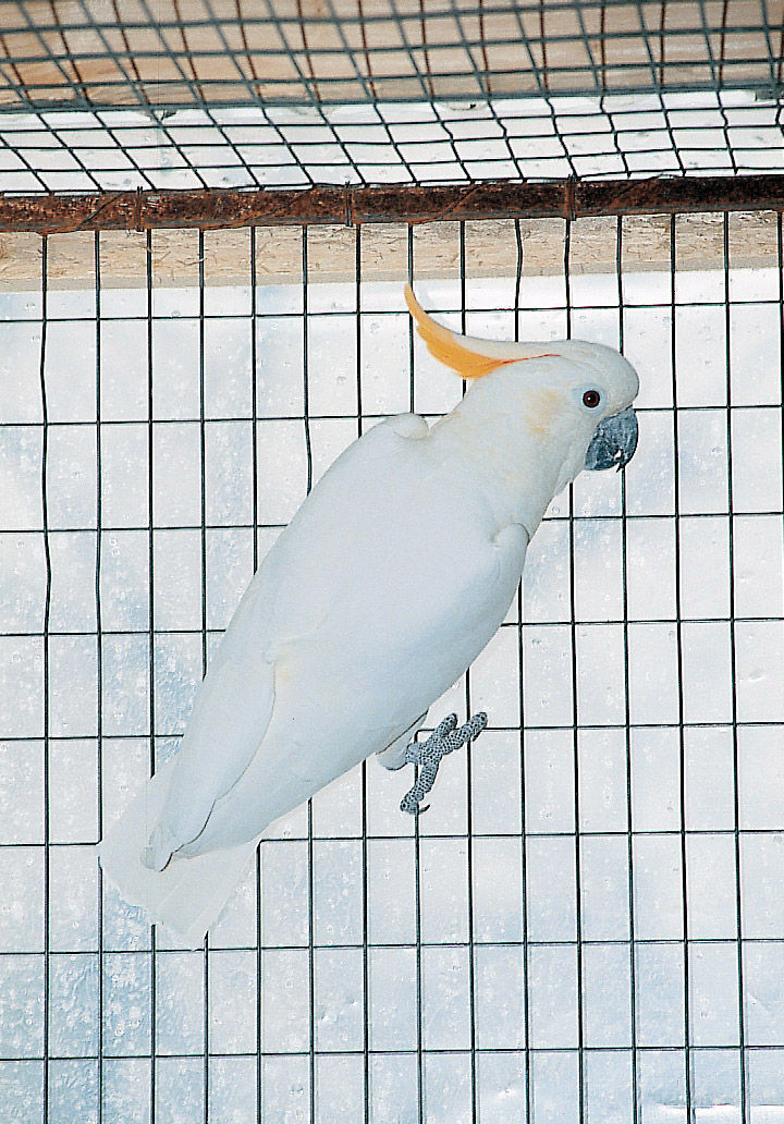 Una Cacatua citrinocristata mientras trepa por la red de la pajarera. (Fotografía de D. Balestri)