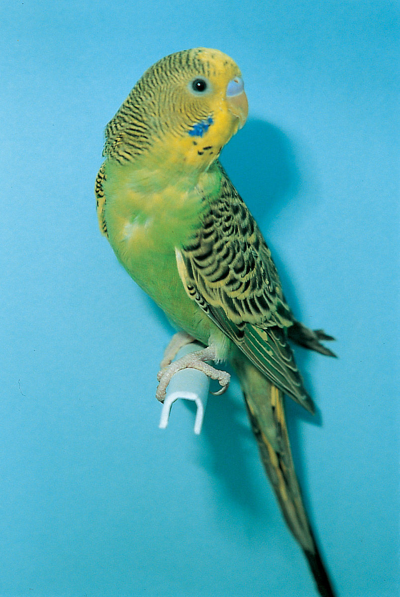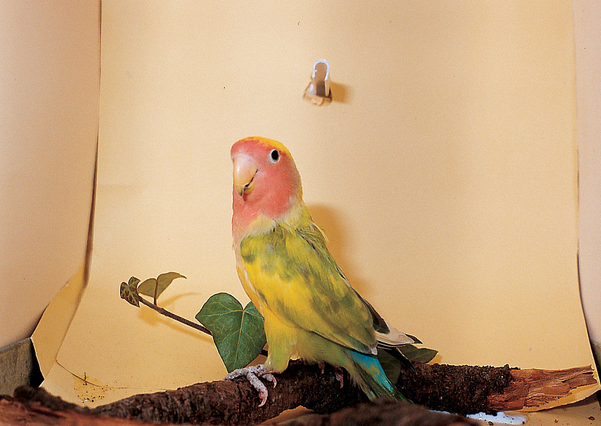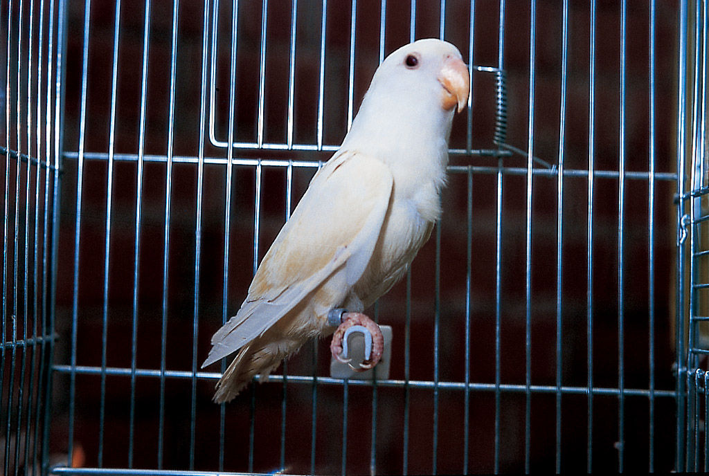 Un A. roseicollis albino con la anilla metálica inamovible en la pata; esta sirve para distinguir los ejemplares nacidos en cautividad, y, por lo tanto, legalmente comercializables, de los de captura