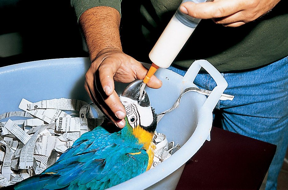 Un Ara ararauna de cuatro meses es alimentada en el criadero Luisa di Alessandria