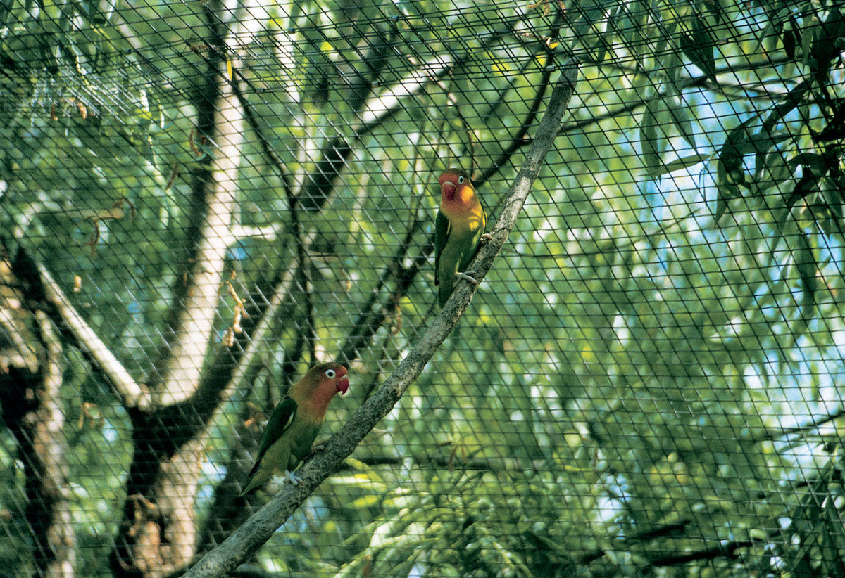 Imagen de una gran pajarera en la que Agapornis fischeri y Agapornis personata forman una colonia mixta
