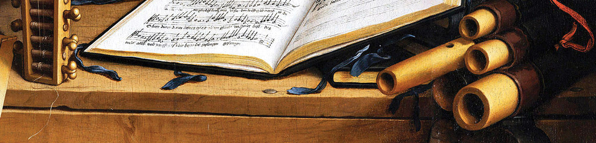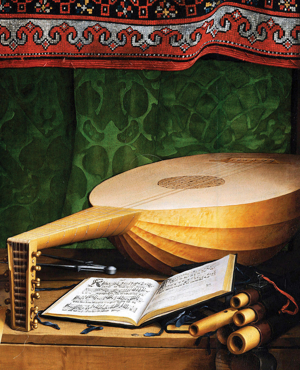 Another field of vision is engendered by the lines of the prayer book on the lower shelf, which intersect with the rosette of the lute. A separate complex of angles is formed by the apex of the set square, the wooden handle of the globe and the pegbox of the lute.
