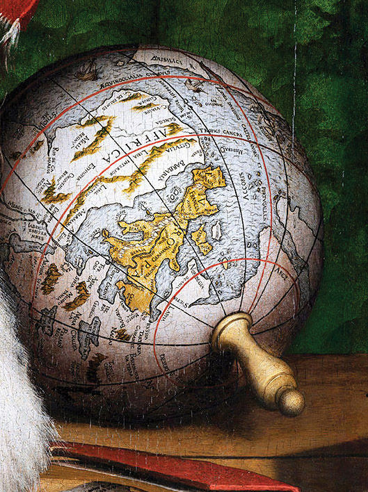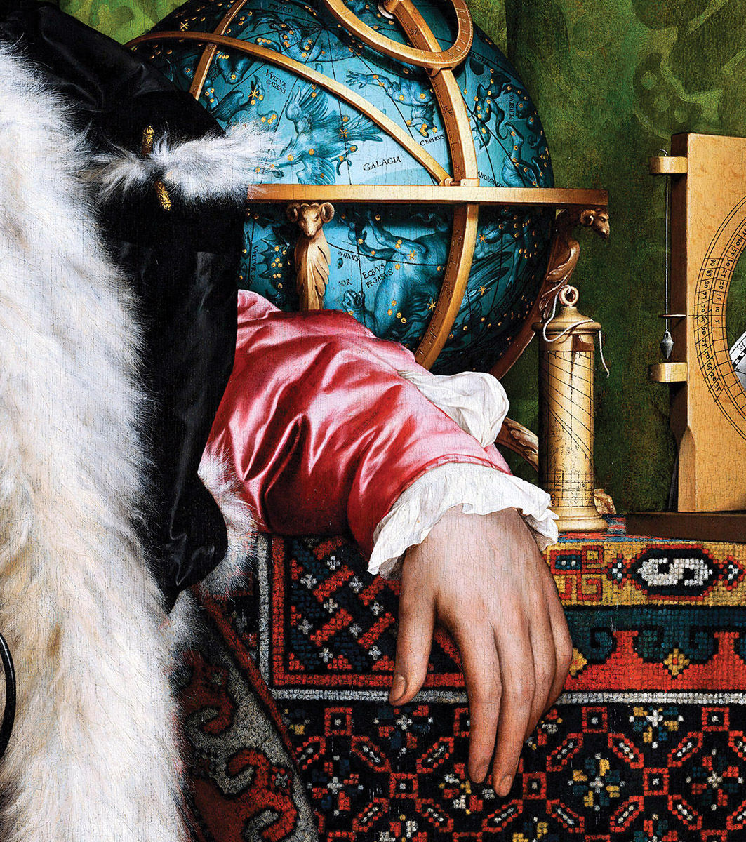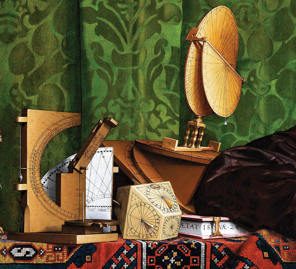 But the horizon line is below eye-level. The foreshortening of the two horizontal wooden shelves in the middle of the picture yields a view from above.[11] Furthermore, the oriental rug on the upper shelf has the effect of dislocating the instruments and objects on top of it from the ambient spatial perspective: the astronomical instruments, ranging from the foldout/collapsible torquetum to the octagonal sundial, are interlocked in a quasi-cubistic manner and seem to drift away from the ambient space created by the centralized perspective. They are isolated from the picture as a whole, constituting an entirely separate pictorial level.