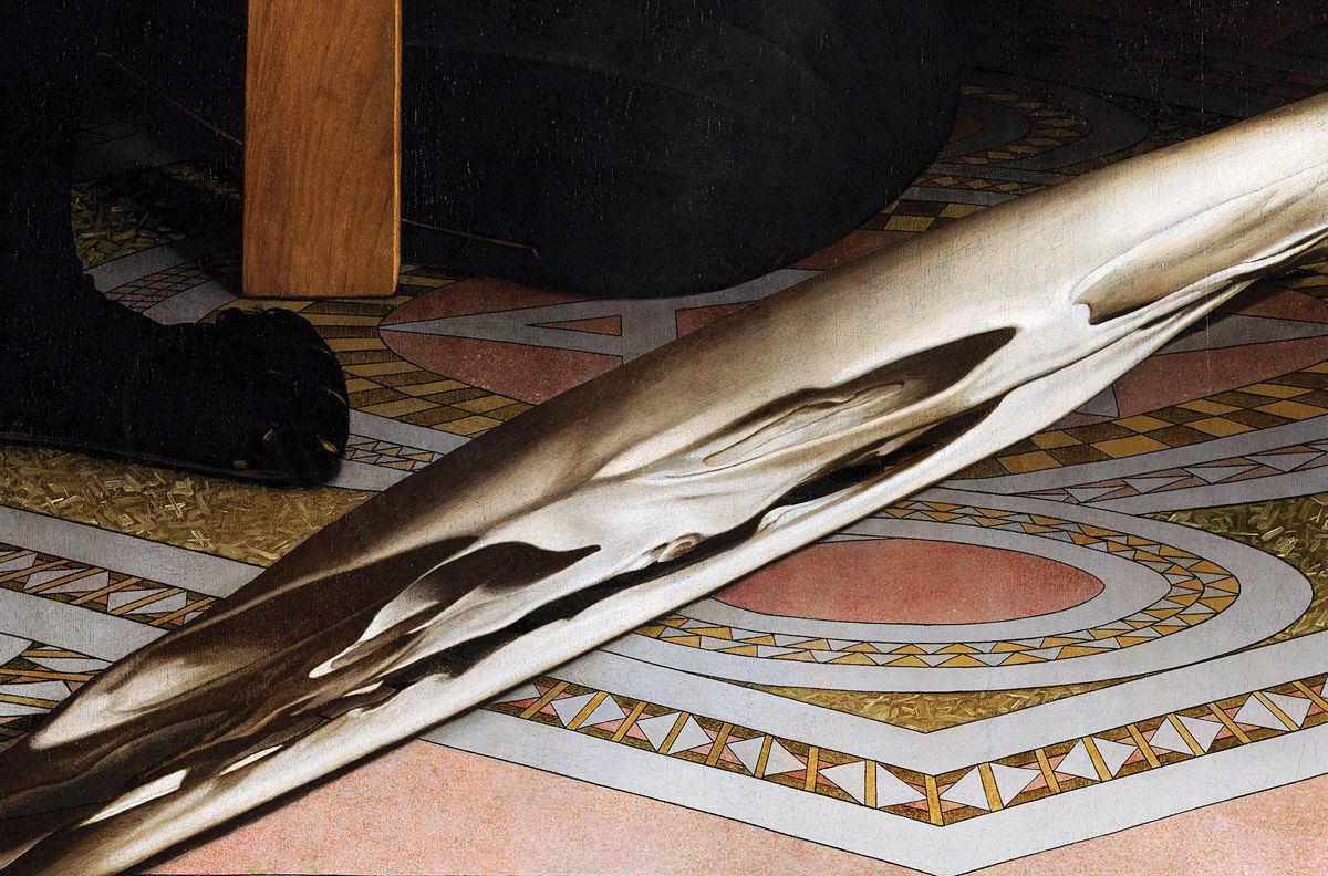 The year of the picture, moreover, coincides with a turning point in the history of England: the divorce of Henry VIII from his first wife, Catherine of Aragon, which gave rise to the schism between the Anglican and the Roman Catholic Church. Indeed, the Cosmati pavement in the picture is borrowed from the mosaic in the sanctuary of Westminster Abbey, which sets the double portrait in the context of the ensuing religious conflict, while the indication of the exact date renders the painted subjets witnesses to this critical moment in history.