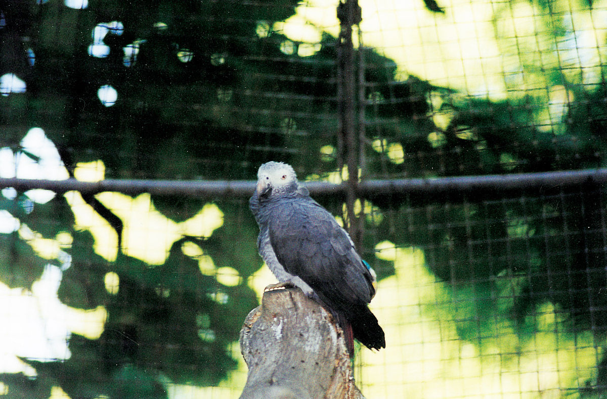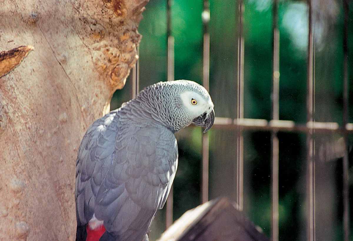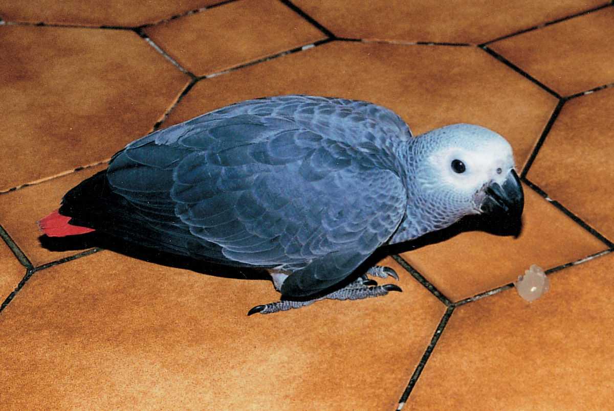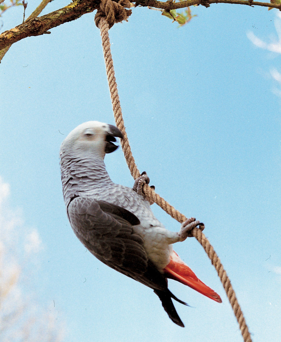 El loro gris, ágil y veloz entre las ramas y en el aseladero, se muestra poco hábil en el suelo, especialmente en superficies lisas o resbaladizas. (Fotografía de M. Herman)