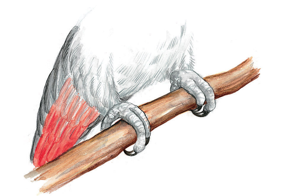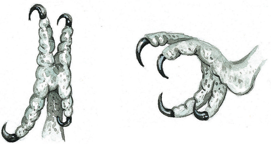 Los dedos terminan en unas uñas largas, fuertes y curvadas, de color negro, que el animal utiliza para sujetar la comida y así poder roerla más cómodamente. Una posición típica es la de mantener el equilibrio sujetándose con una sola pata, y servirse de la otra para llevar la comida al pico.