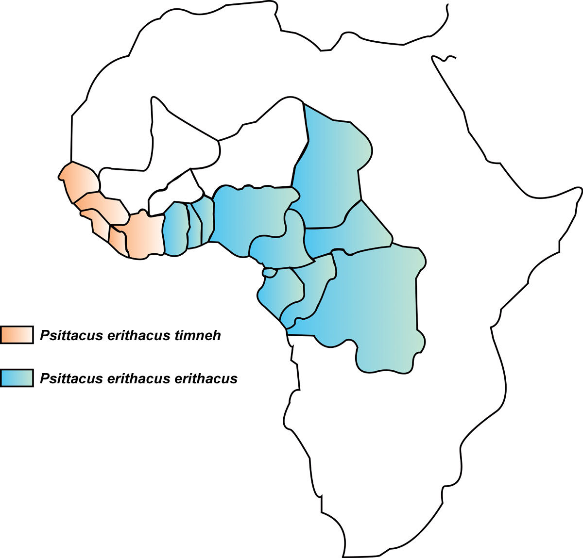 En cambio, Psittacus erithacus timneh, la segunda subespecie clasificada, localizada en Liberia y Sierra Leona, presenta diferencias mucho más evidentes con respecto a la de referencia: el tamaño es más pequeño, la coloración es más oscura, la cola presenta un color vino con tonalidad castaño rojiza, y la parte superior del pico, pese a tener la misma forma que en la especie de referencia, adquiere un tono rosa amarillento en la inserción.
