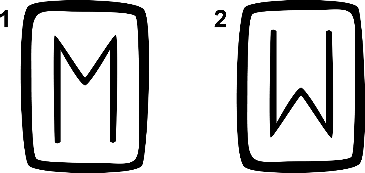 Por ejemplo, la runa del movimiento, Ehwaz, del derecho, es (1), y del revés, (2). La lectura del revés llama su atención sobre aspectos de una situación que pueden dificultar el movimiento, o sobre el hecho de que el propio movimiento puede ser inadecuado en ese momento.