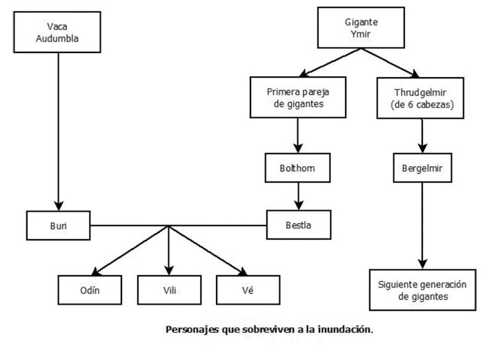 Odín, Vili y Vé acabaron con Ymir. La riada de sangre fue tal que todos los gigantes, salvo dos, perecieron en la inundación que sobrevino poco después. Ocultos en el tronco de un árbol estaban Bergelmir —«aullador de las montañas», cuyo padre era aquel gigante monstruoso de seis cabezas engendrado por los pies de Ymir— y su esposa. De este modo consiguieron sobrevivir para convertirse en los padres de la siguiente generación.