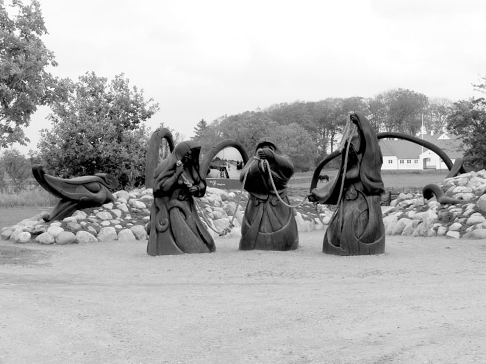 Escultura que representa a las tres nornas en Ribe, Dinamarca.