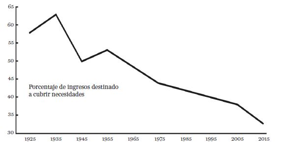 El gráfico 2.1 muestra la caída en picado de la parte de nuestros ingresos que dedicamos a sobrevivir en Estados Unidos. En otras palabras, estamos viviendo una época de máxima renta disponible. Si se miran a través del prisma de la historia, las matrículas universitarias, los cruceros de Disney, los coches de lujo que se conducen solos, las salidas nocturnas por la ciudad, las salas de cine con sillones gigantes de cuero y, por supuesto, nuestra capacidad de ahorro para una jubilación tranquila son fenómenos relativamente nuevos.